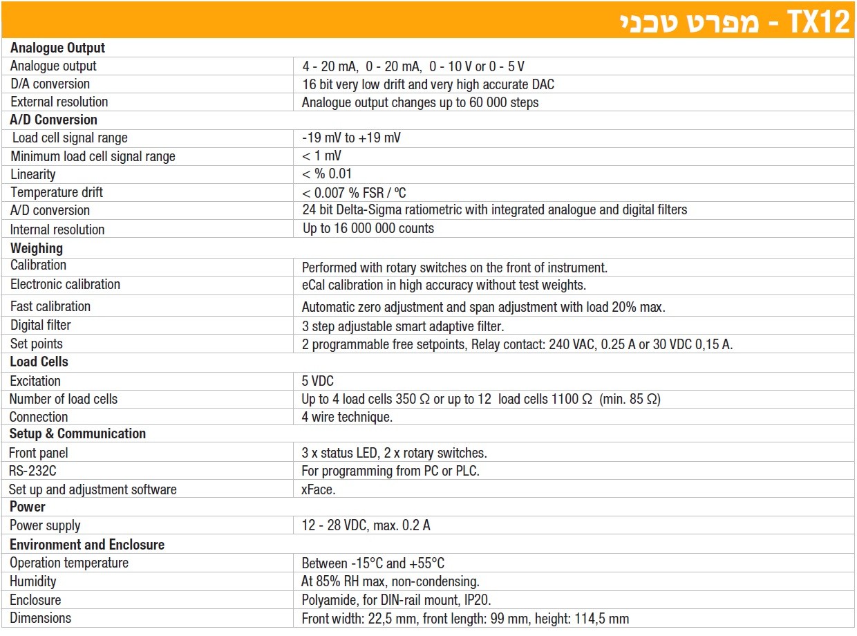 TX12 הינו בקר שקילה תעשייתי אנלוגי, מדויק וחסכוני, שמשתלב בקלות במערכות בקרת תהליכים ומדידת כוח.